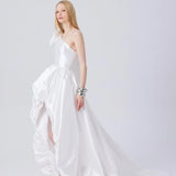 The white, voluminous balloon skirt creates an elegant silhouette for the bride on her special day. The front-short, back-long design of the skirt adds a dynamic and graceful touch, creating a visually striking effect. The upper part of the dress features a one-shoulder design, offering modern elegance. The delicate ribbon on the shoulder adds a romantic detail to the dress while also providing a classic touch.