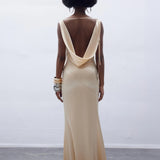 The dress is made from soft and flowing silk fabric. Its slightly low neckline creates an elegant silhouette, while the deep back neckline design adds a sophisticated touch. The asymmetric stitching detail gives the dress a modern and eye-catching look.